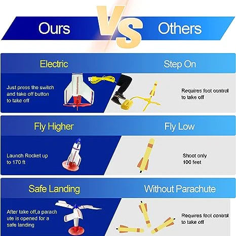 - Rush to the sky & Safe Landing: This rocket launcher for kids 8-12 can reach a maximum altitude of 150 feet! Take it to an open space and start your rocket launch journey! The body of rocket launcher for kids will automatically open as propeller to landing safe.